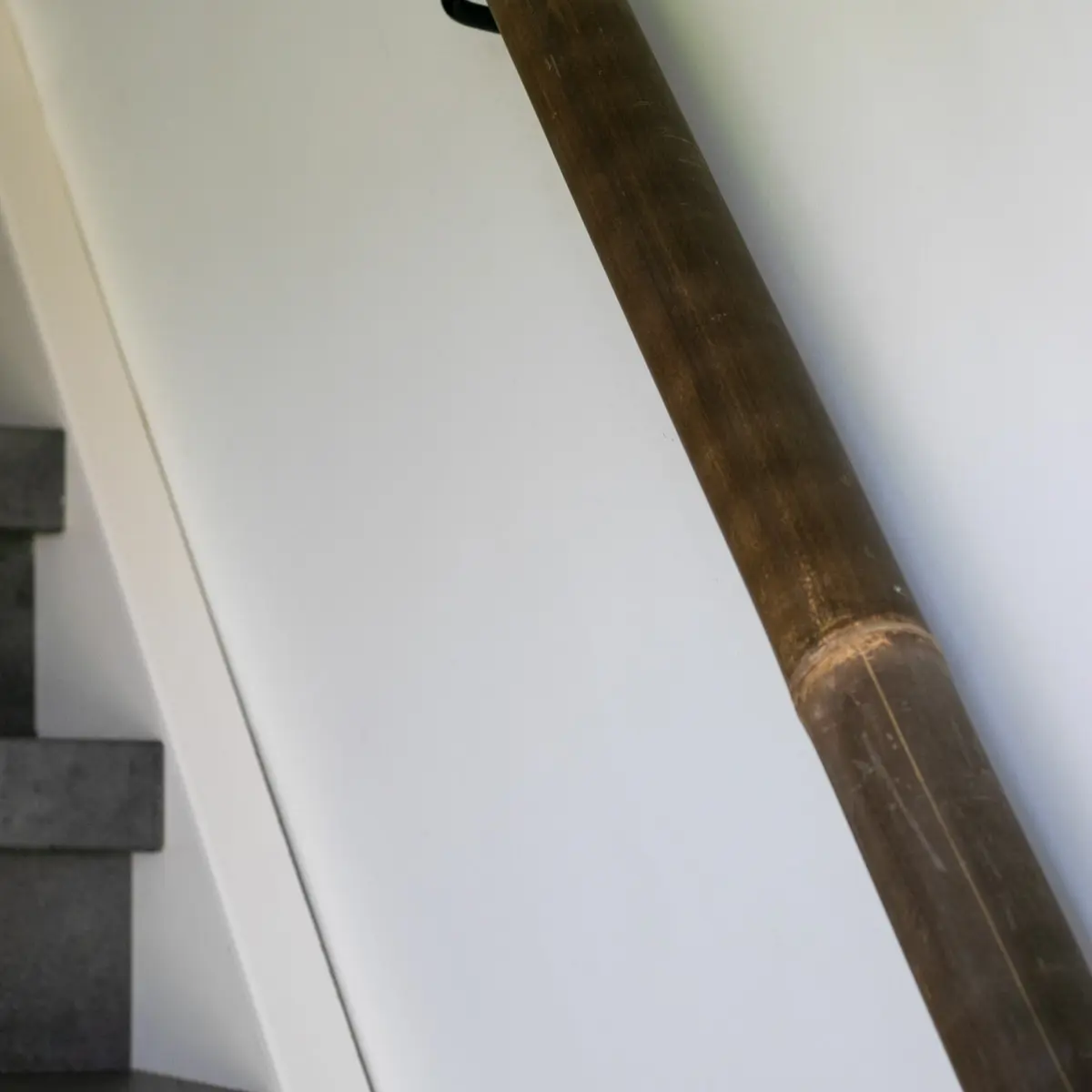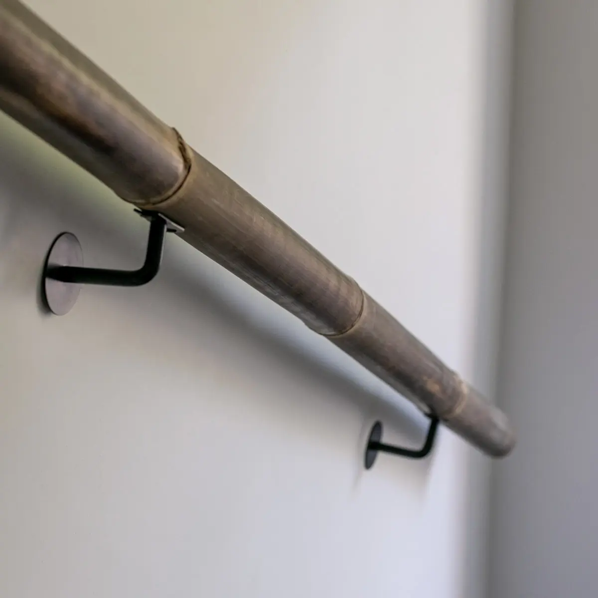 Der Handlauf wird sorgfältig nach Form, Festigkeit und Farbe ausgewählt und anschließend glatt geschliffen, um ein angenehmes und sicheres Griffgefühl zu gewährleisten. Jeder Bambusstab ist ein Unikat – mit natürlichen Abweichungen in Struktur und Durchmesser, die für ein authentisches, lebendiges Aussehen sorgen.