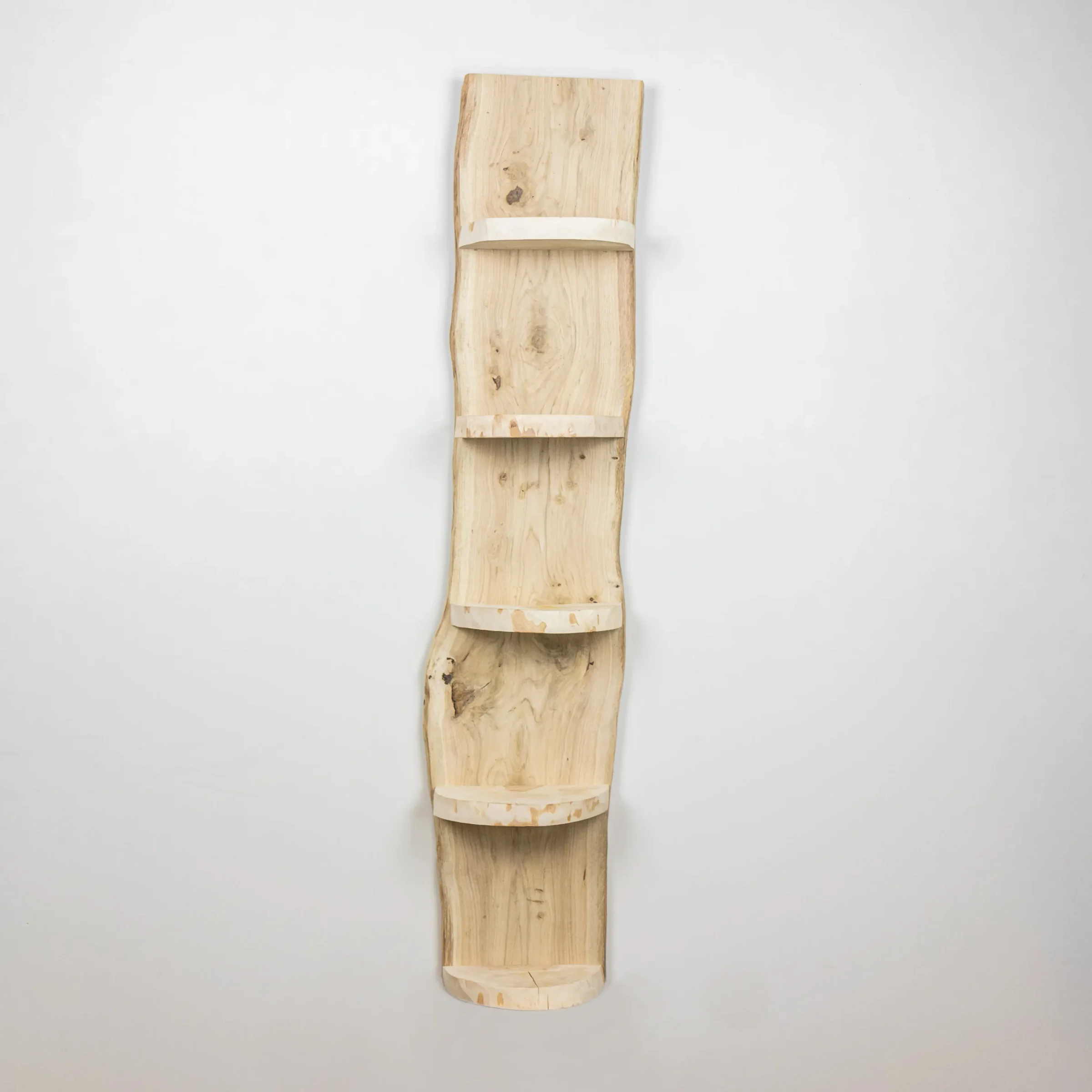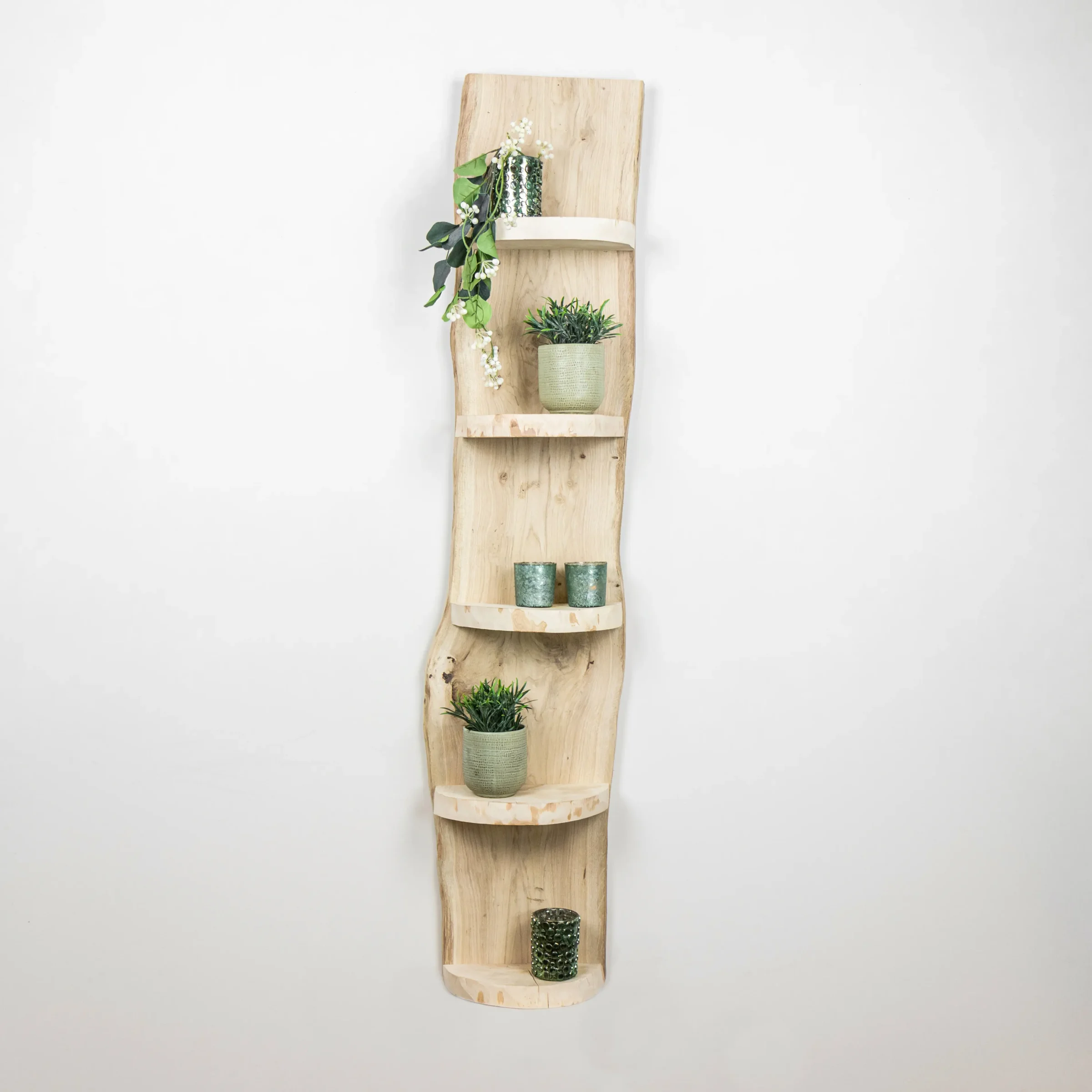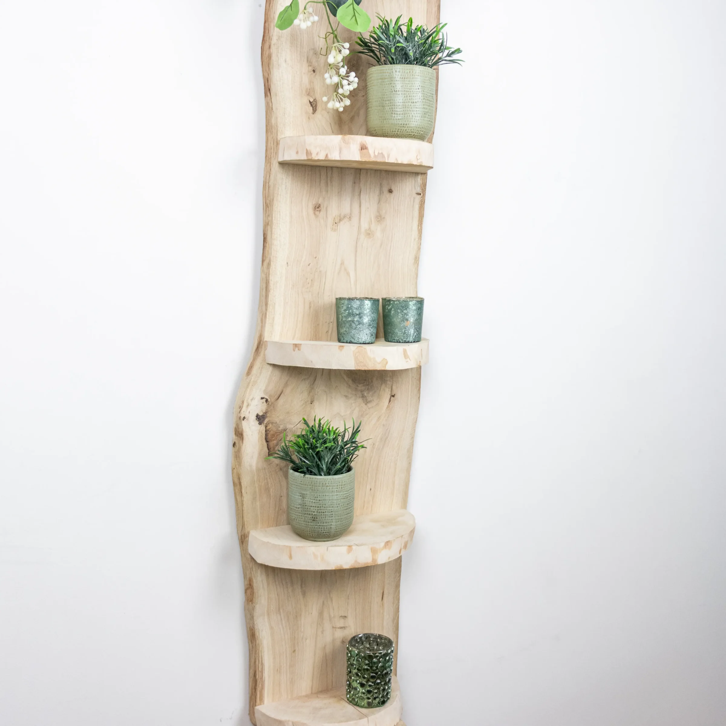 Dieses Wandregal aus der Esper-Serie ist aus echtem Eichenholz gemacht. Das Holz ist entrindet und unbehandelt, sodass die helle natürliche Holzfarbe schön sichtbar bleibt. Mit 5 Ablageflächen bietet das Regal Platz für Kerzen, Pflanzen oder kleine Accessoires.