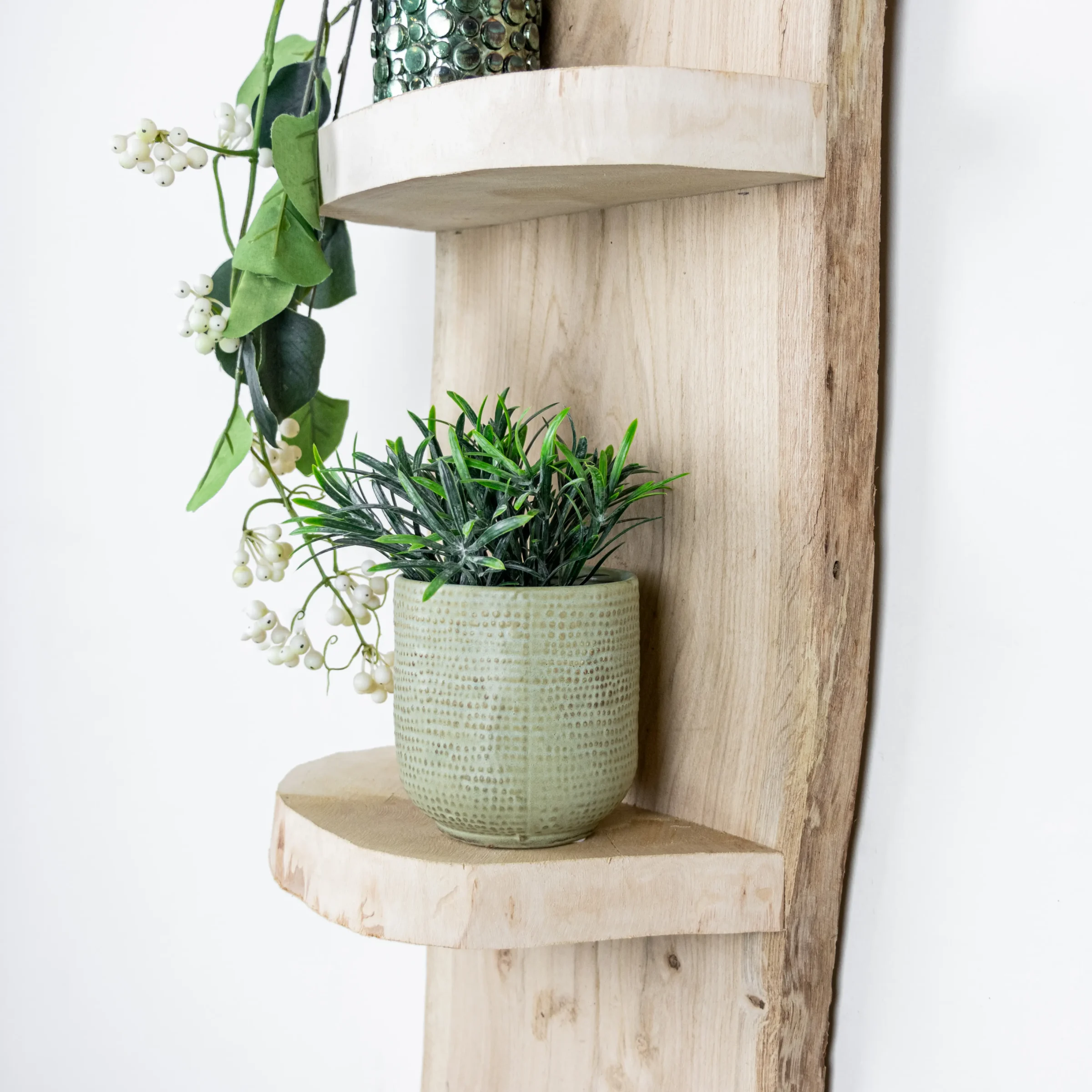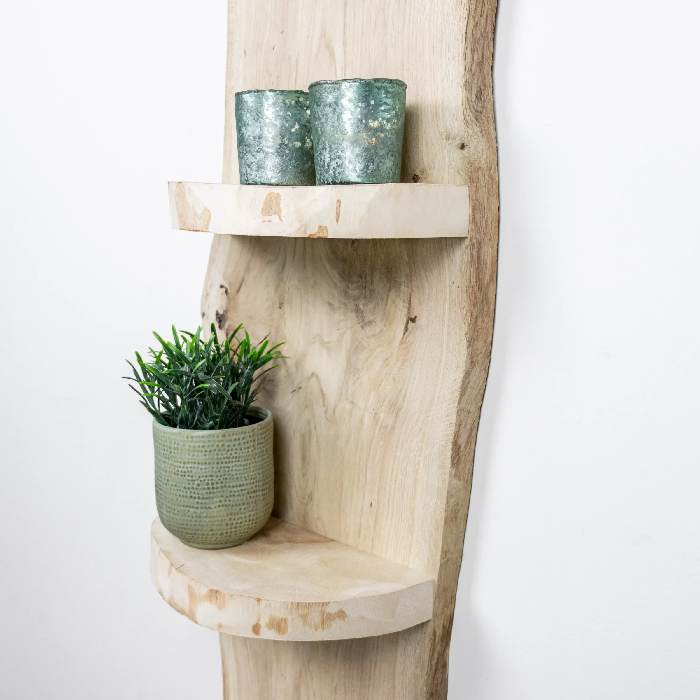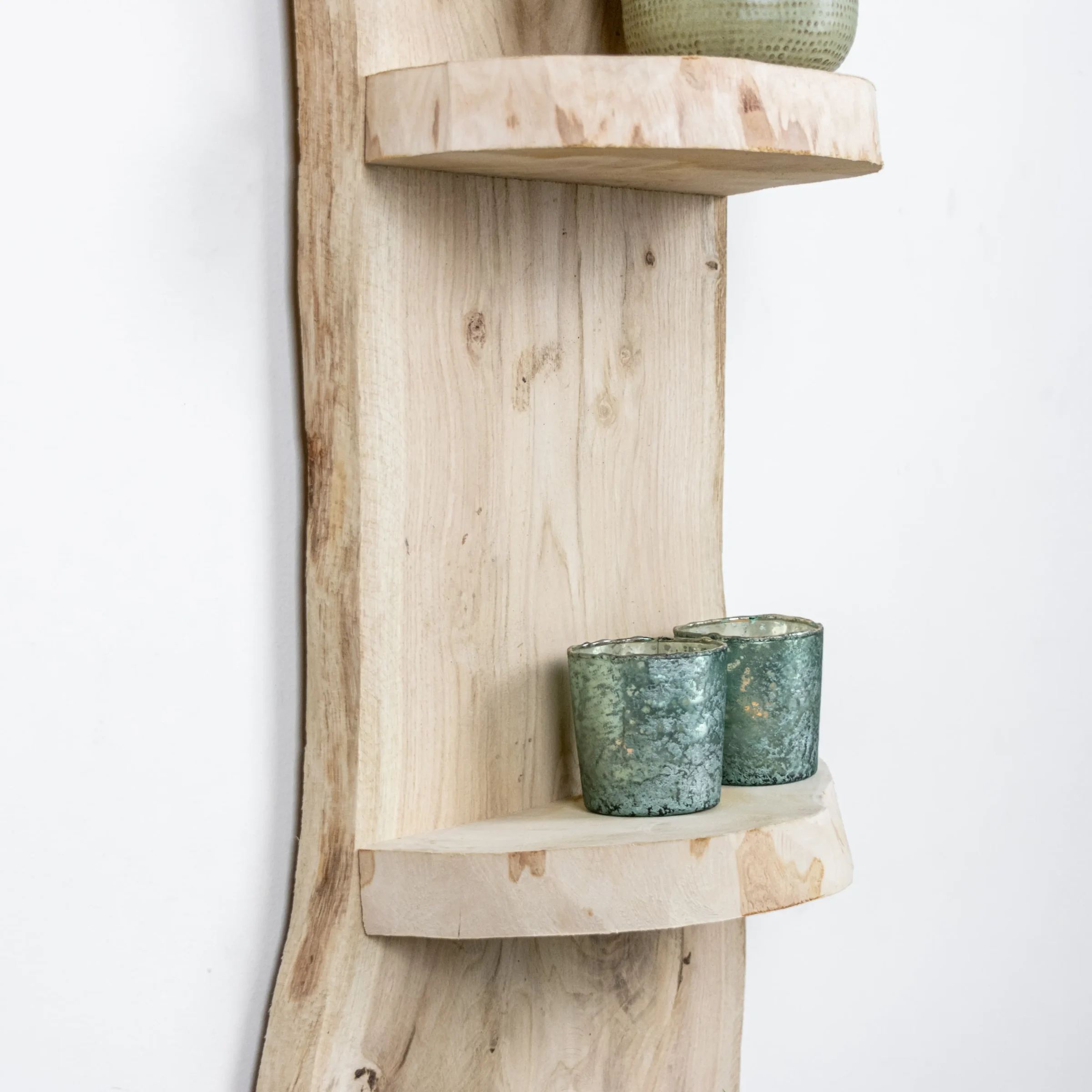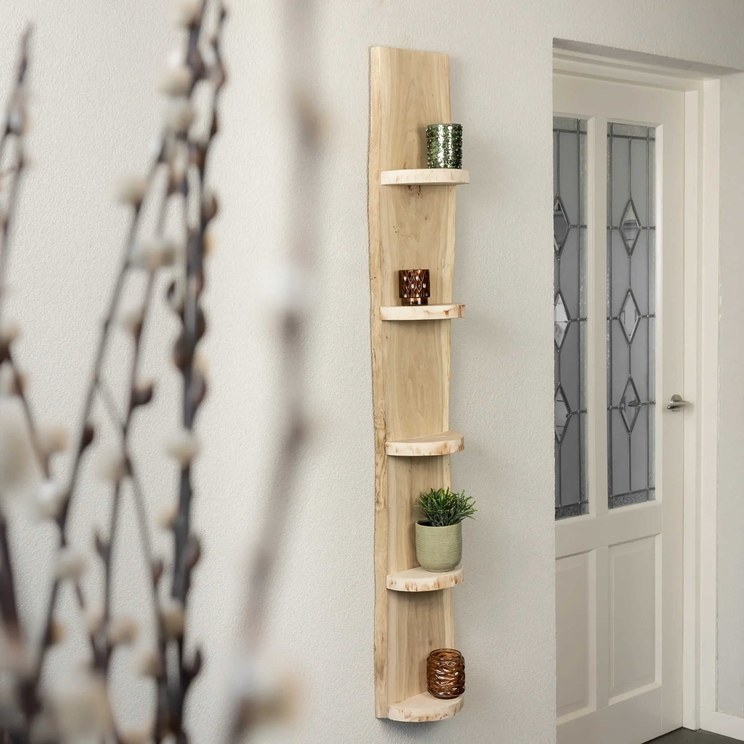 Dank seiner kompakten Größe und der natürlichen Form des Holzes passt dieses Baumstammregal sowohl in ein modernes als auch in ein ländliches Interieur. Es lässt sich einfach an der Wand befestigen und ist ideal als dekorativer Akzent.