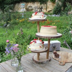 Wie bereits erwähnt, ist die Stimmigkeit des Gesamtbildes eine Voraussetzung für die perfekte Gasterfahrung. Es geht also einerseits um das serviceorientierte Bedienen, aber auch um die Art und Weise des Servierens. Diese Etagere aus rustikalen, entrindeten Baumstämmen und Holzscheiben eignet sich hervorragend zur Präsentation von Snacks oder Getränken.