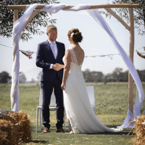 Ein Hochzeitsbogen lässt sich ganz individuell dekorieren und gestalten. Wählen Sie Stoffbänder und Trockenblumen in den Farben des Brautstraußes oder der Tischdeko.
